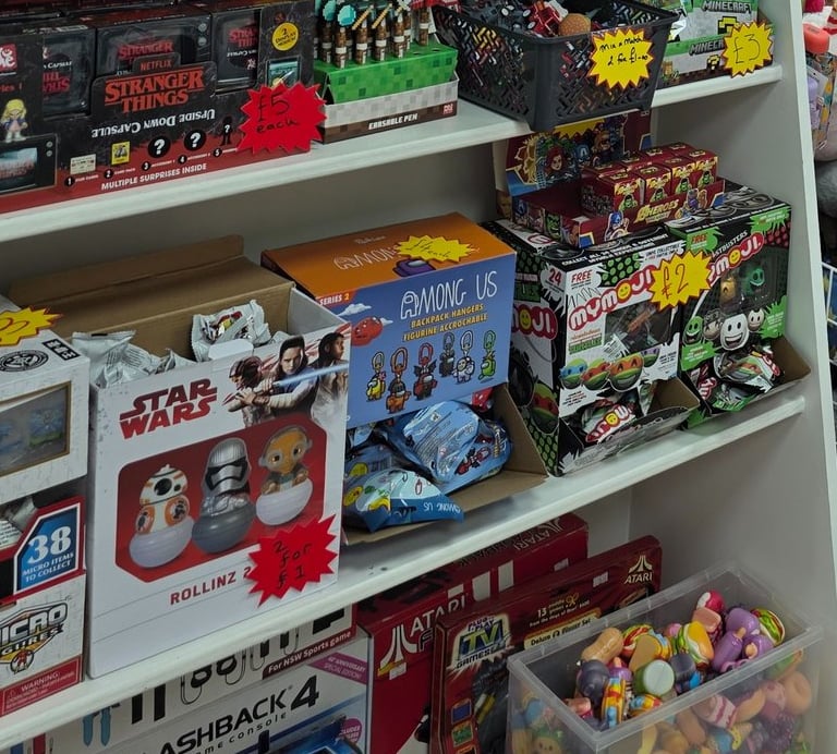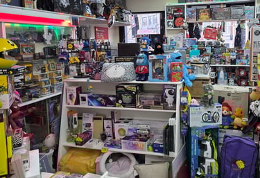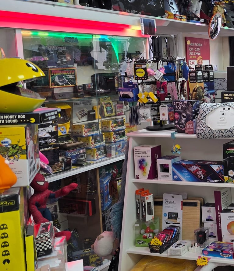 Visit our London shop for retro games, consoles, and clothing. Explore unique items in a comic book-themed atmosphere!