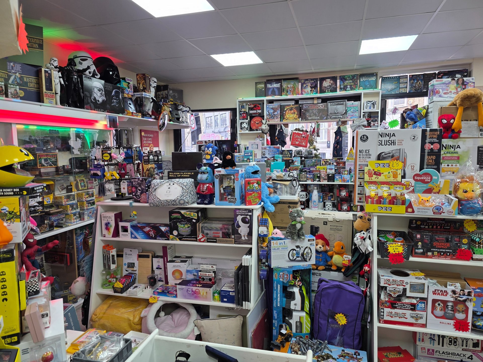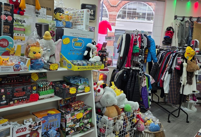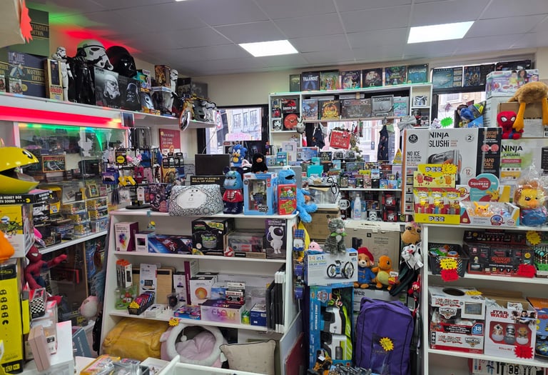 Visit our London shop for retro games, consoles, and clothing. Explore unique items in a comic book-themed atmosphere!